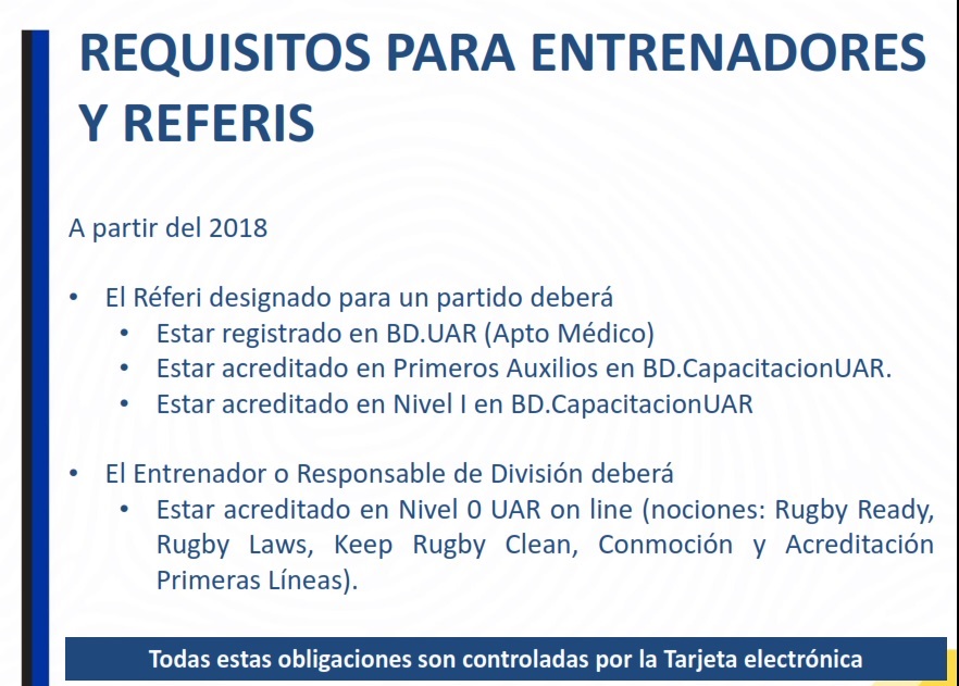 A partir del próximo año , temporada 2018 , los Entrenadores de divisiones deberán contar con Acreditación UAR al igual que los Réferis.